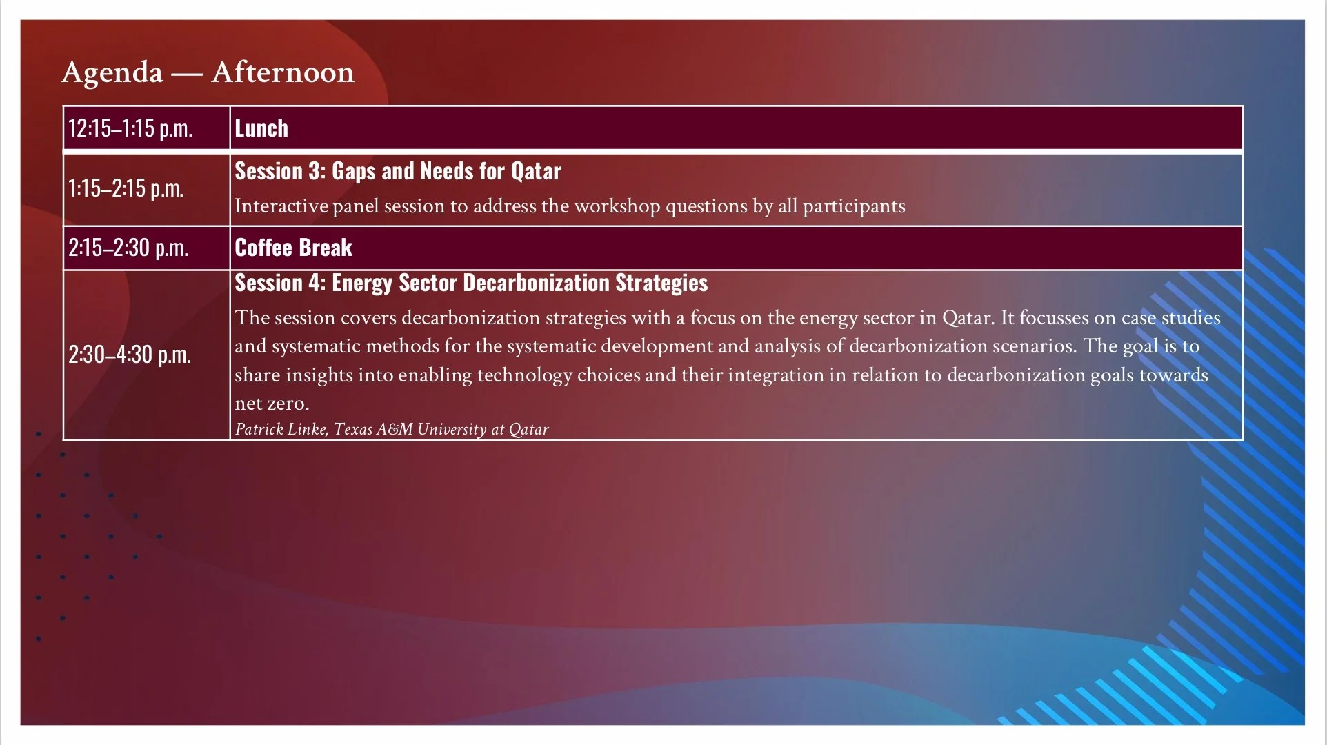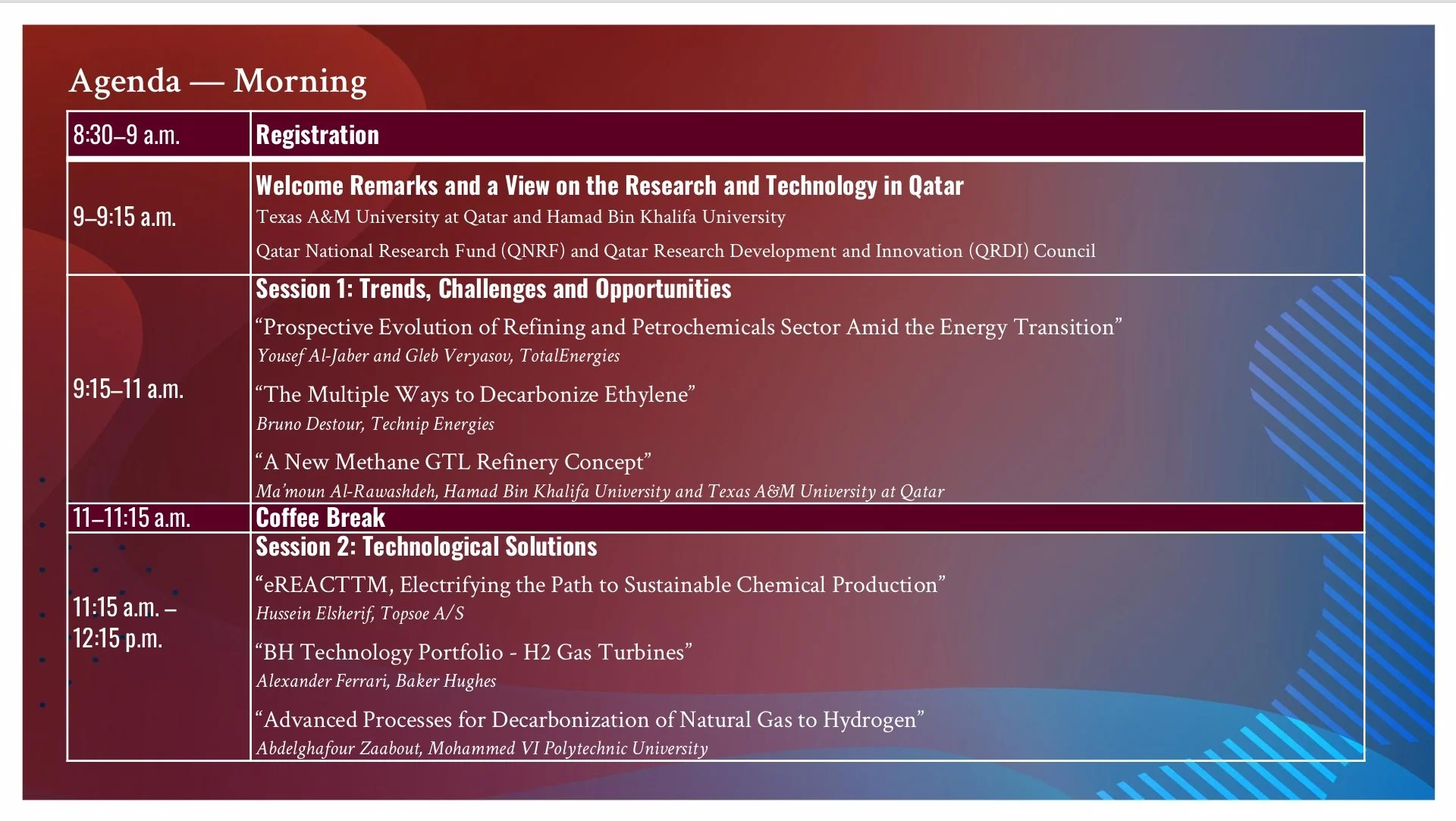The workshop has distinguished speakers from industry and academia including TotalEnergies, Technip Energies, Topsoe, Baker Hughes, Texas A&M University at Qatar, Mohammed VI Polytechnic University, and Hamad Bin Khalifa University. The workshop has an interactive panel session to define challenges and opportunities for the case of Qatar.